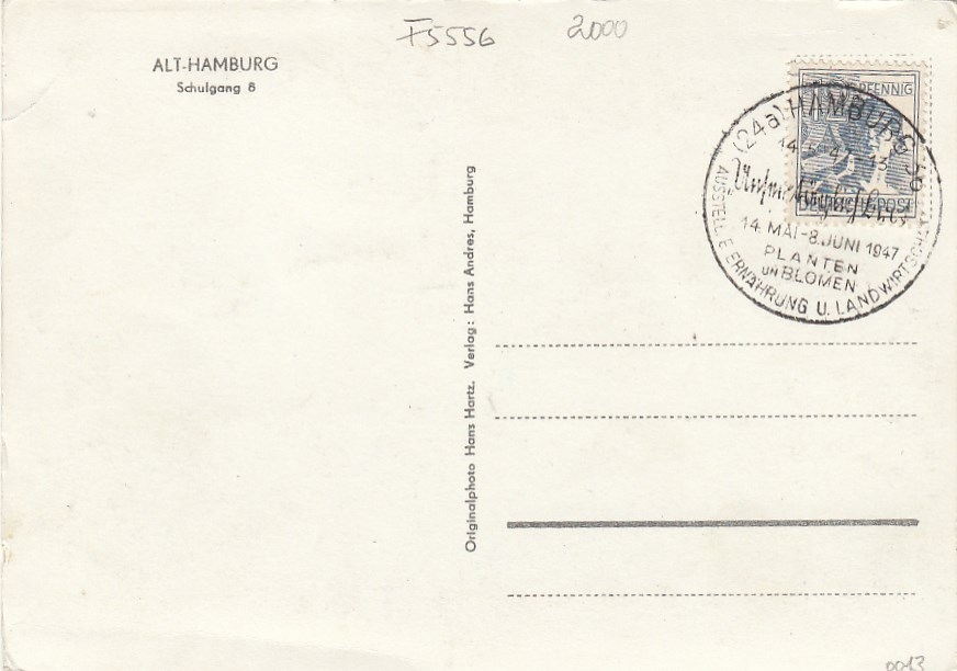 Alt-Hamburg, Schulgang 8, Stempel Planten und Blomen 1947 ngl F5556